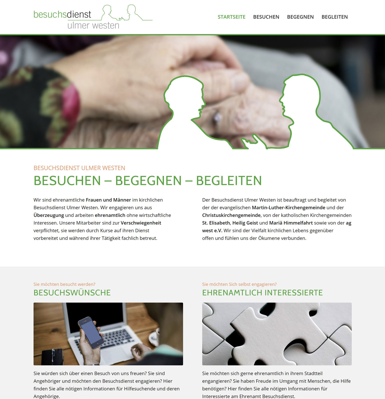 Die Website für den Besuchsdienst Ulmer Westen wurde mit dem Redaktionssystem WordPress umgesetzt und kann von den Mitarbeitern betreut werden. Neben Informationen zu Besuchswünschen finden sich auch Ansprechpartner und Informationen für ehrenamtliche Helfer.