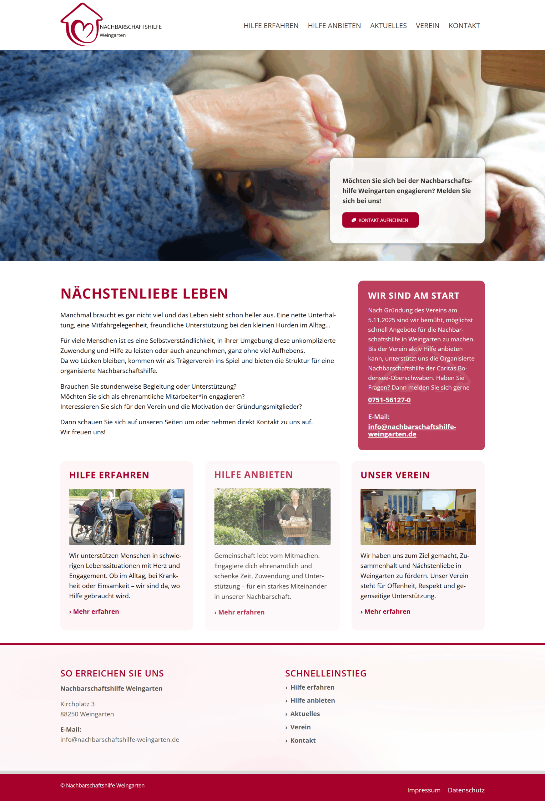 Die Nachbarschaftshilfe Weingarten steht für gemeinschaftliches Miteinander, praktische Unterstützung im Alltag und wertvolles Ehrenamt – genau das wollten wir mit einem übersichtlichen, modernen und barrierearmen Webauftritt in WordPress sichtbar machen.